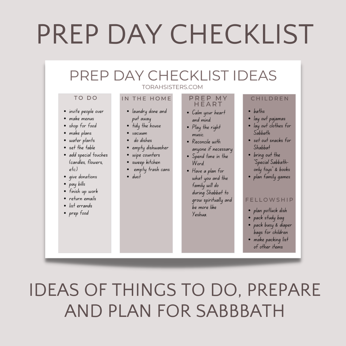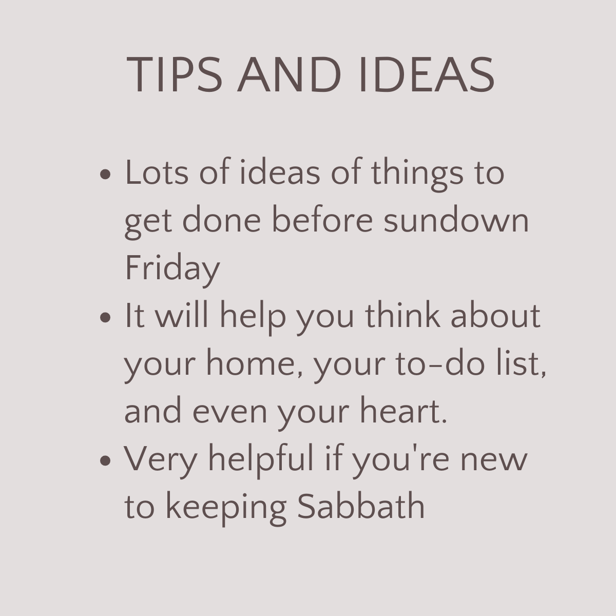 These are just ideas. The Bible doesn't say most of these items, and some are just traditions. Some are things I do for my family, and some are ideas I've gathered from others. Use this checklist for ideas so you can make your own checklist based on your own convictions and your family's needs. Sometimes my Sabbath is very simple, and sometimes it requires more preparation. But this checklist should cover the "big" items for most families.