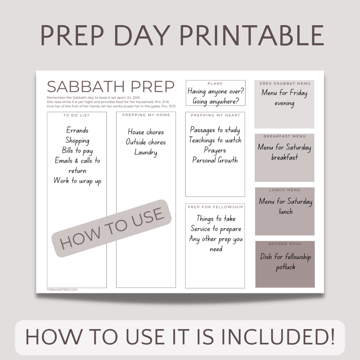 Get your Prep Day organized with this elegant but super helpful printable. It has room to keep track of things you plan for your Prep Day and Sabbath. You don't have to use every part of this, just the parts that are useful to you. Start using it on Sunday so that when Friday arrives, you have a plan! This will help you enter Shabbat knowing you did all you could, nothing was forgotten, and ready to set your heart on the important things.