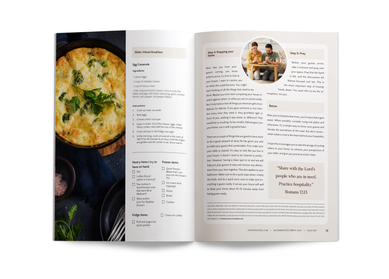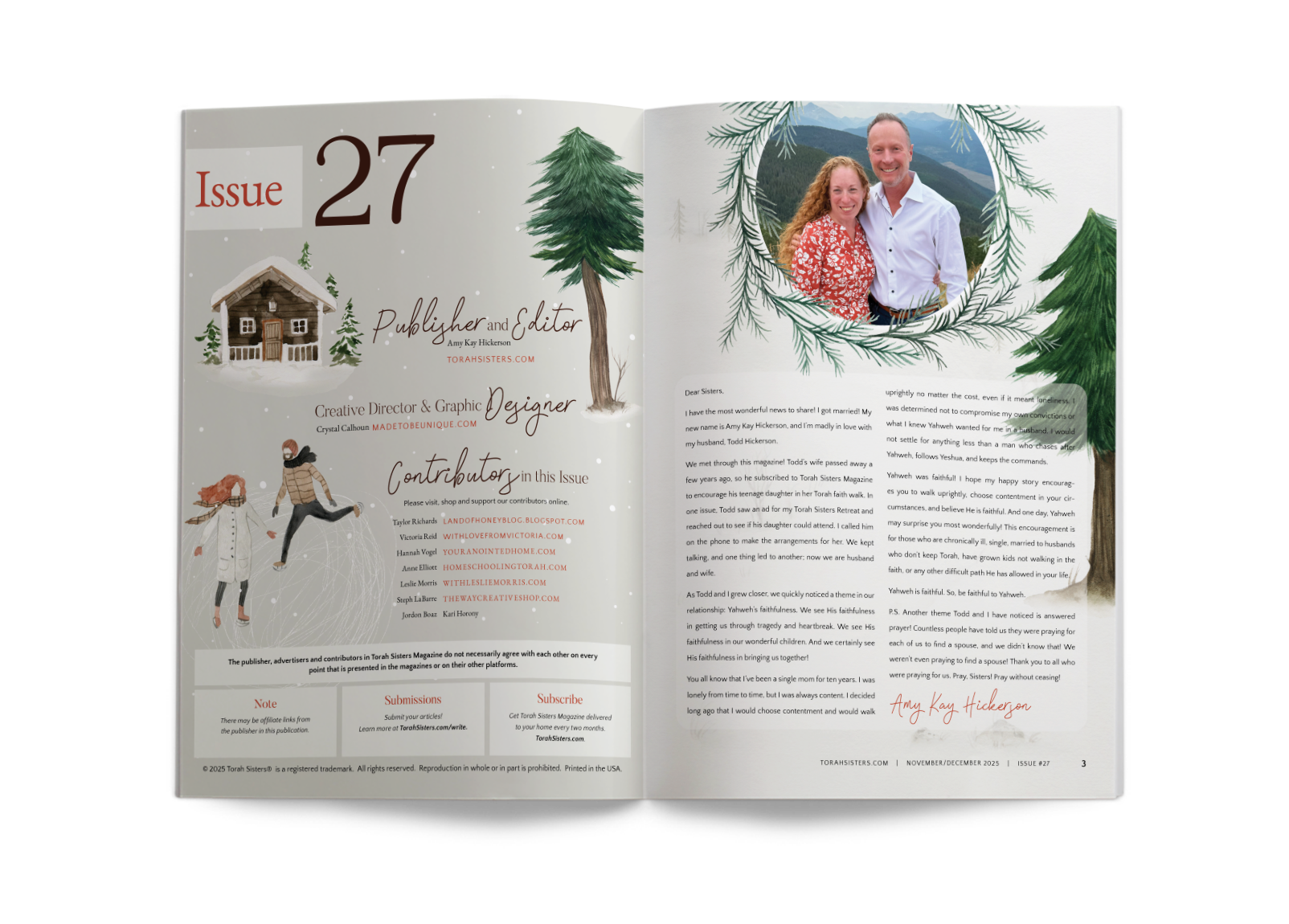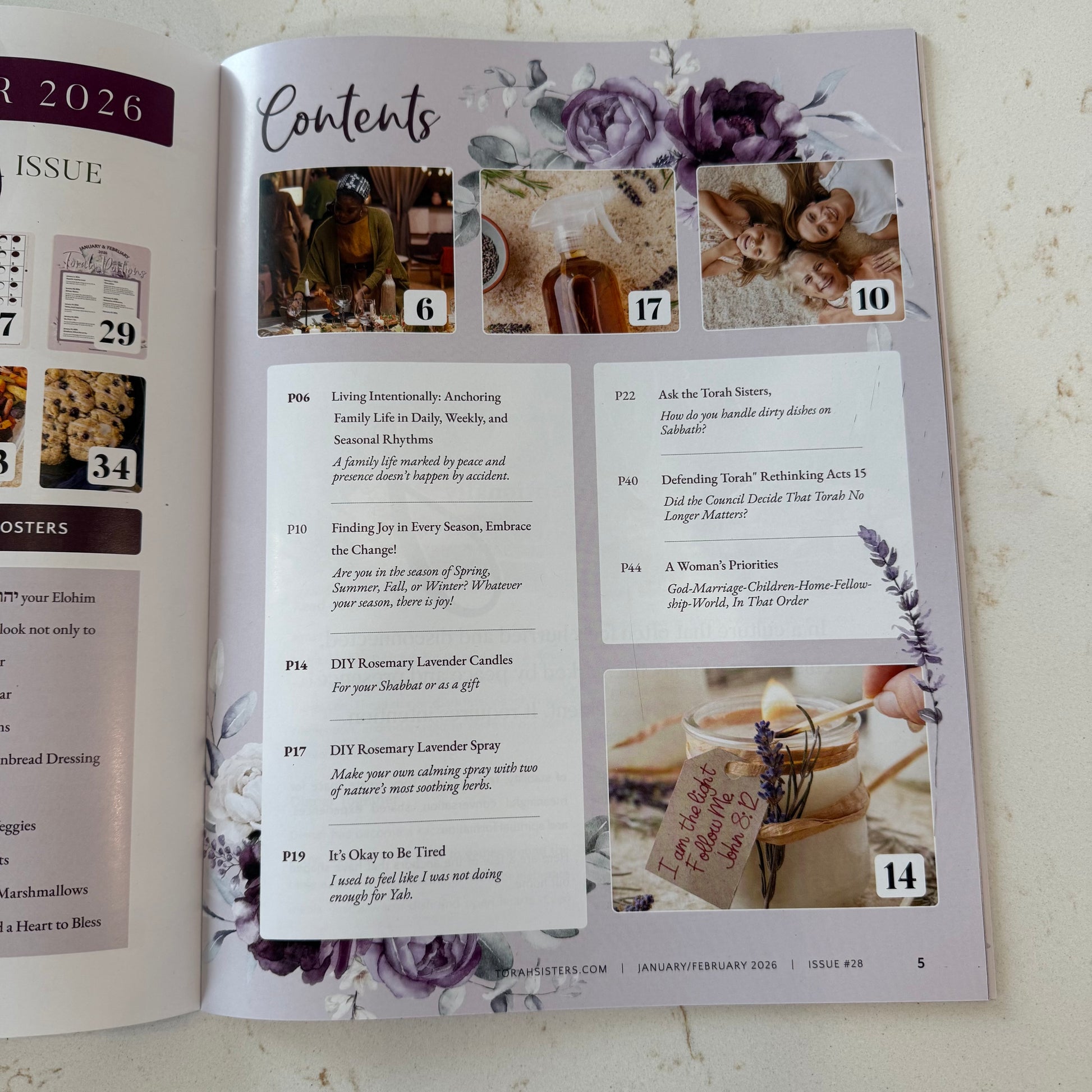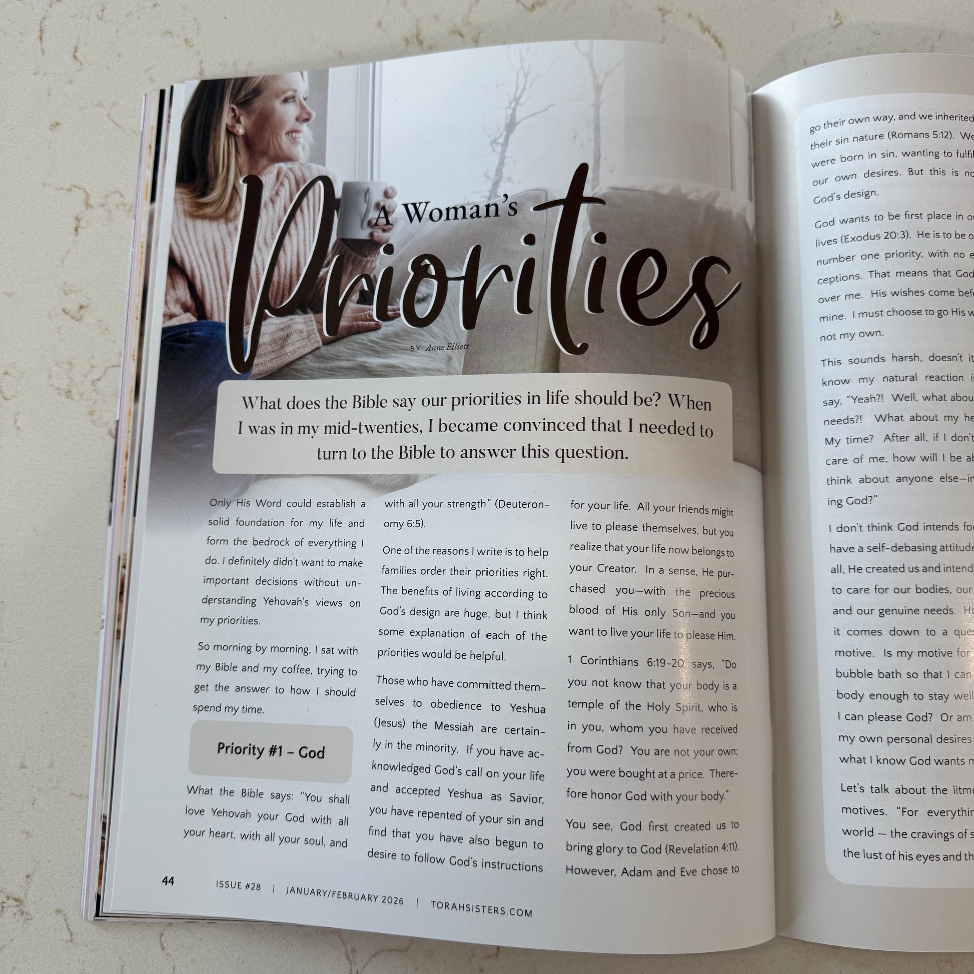 The magazine is a work of love from me and Todd, the authors, and the advertisers. The previous issues have been an enormous blessing to Torah Sisters worldwide, and I know this issue and those to come will also help in your faith walk. Those involved and I are so excited to bring this to you!